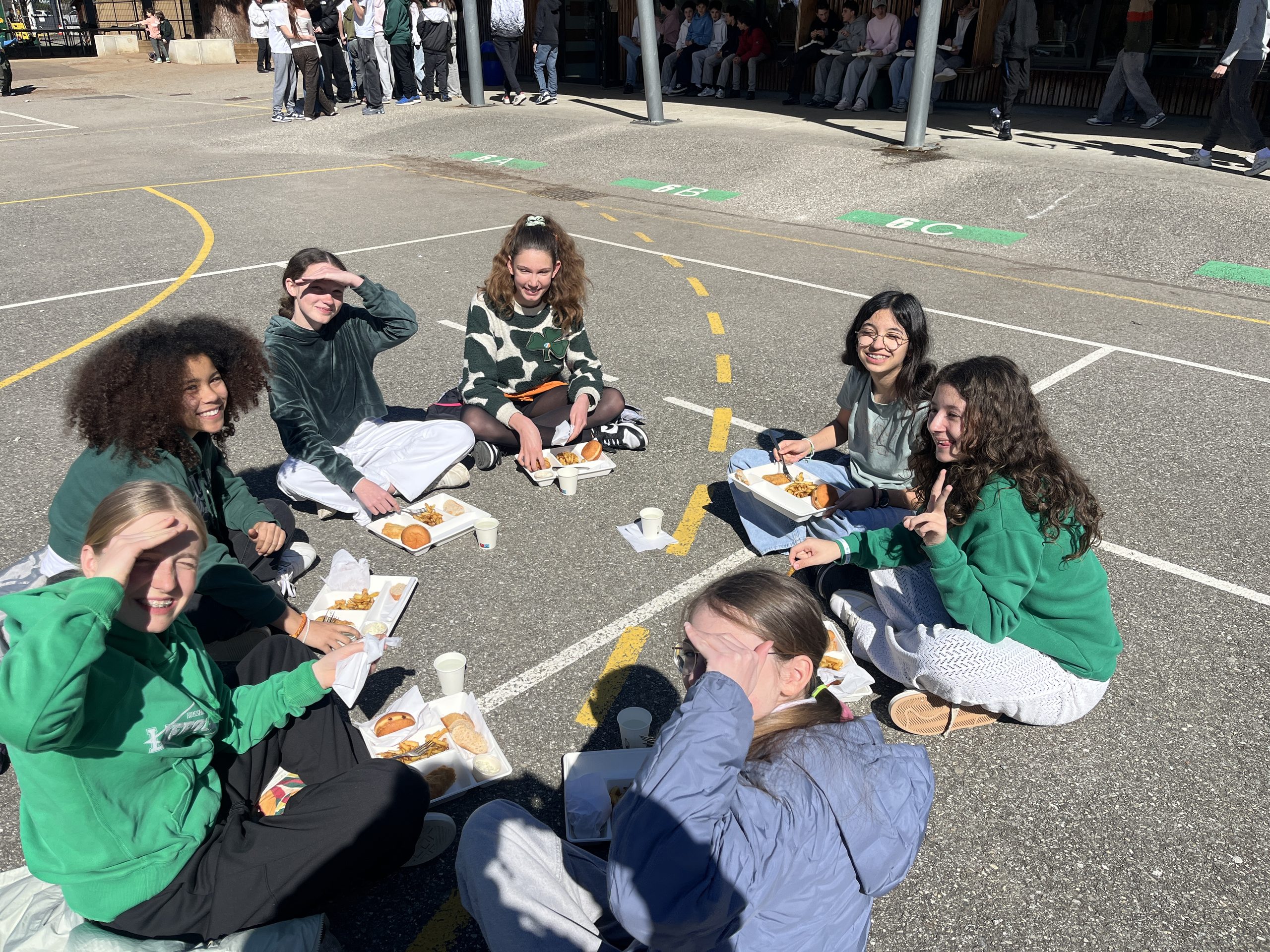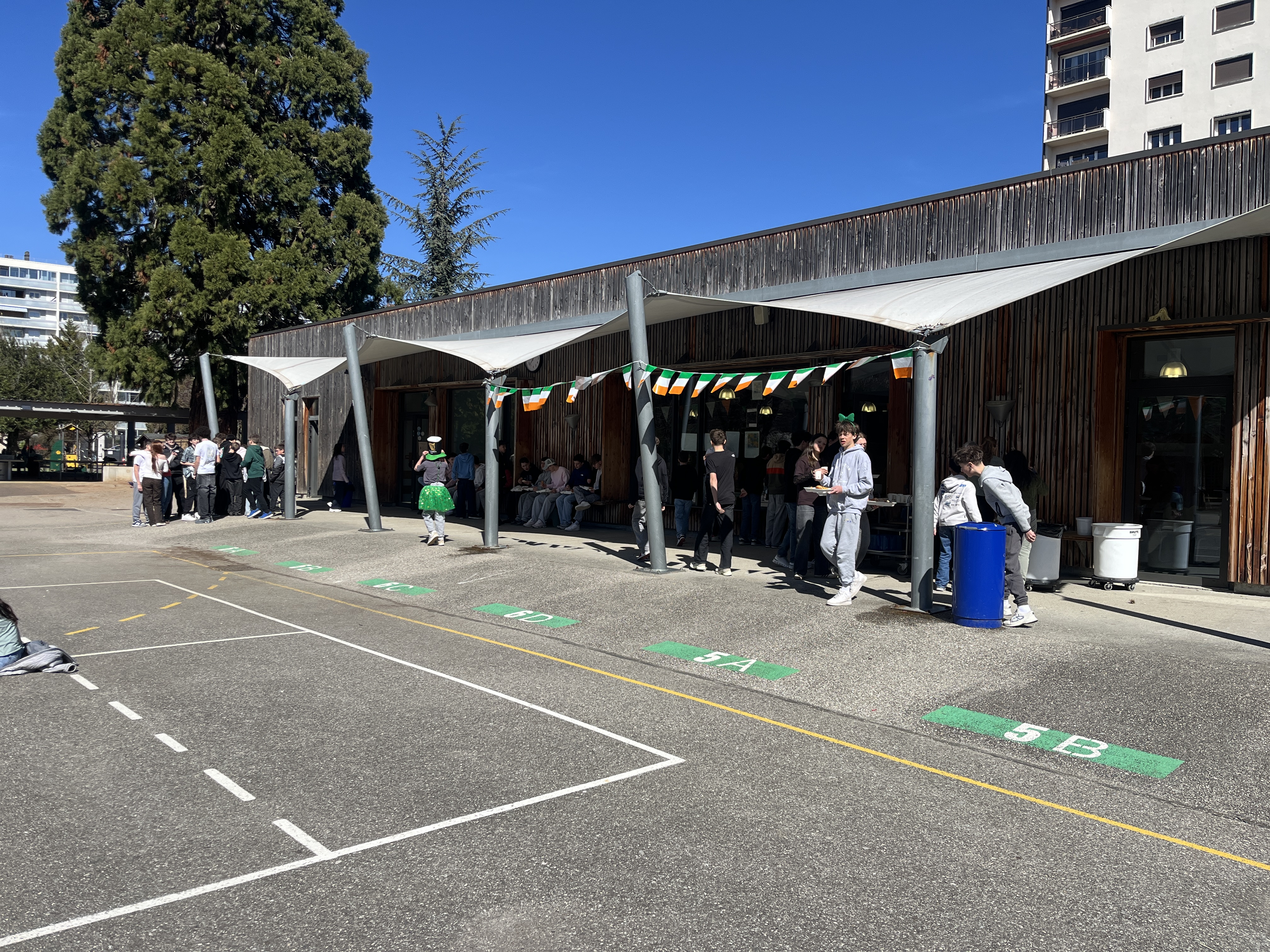 Ce mardi 17 Mars, le jour de la Saint-Patrick, nos élèves ont eu la chance de pique-niquer dans la cour d’un repas typique anglo-saxon, « Fish and chips » avec poisson et frites « maison » accompagnées d’un délicieux donuts.